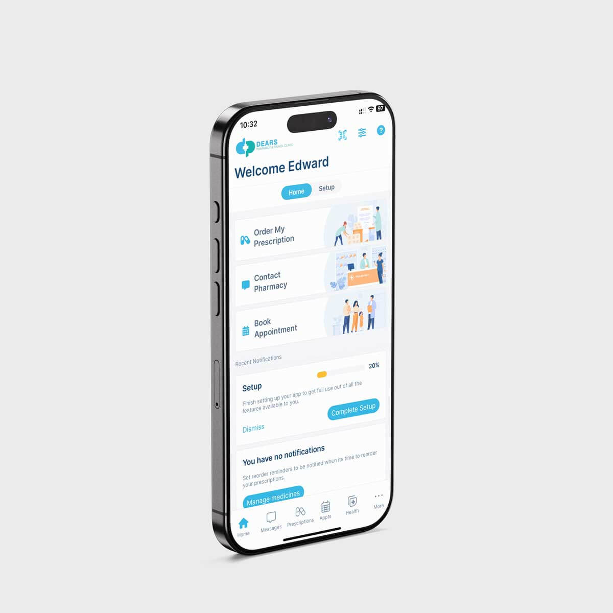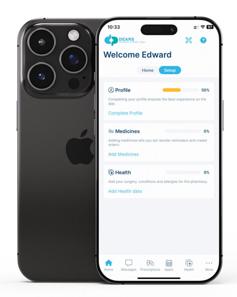 Download the Dears Pharmacy App to your mobile phone. You can click on the Google or Apple button on this page which will show you how. When you’ve downloaded the app, set up an account and find your local Dears Pharmacy.